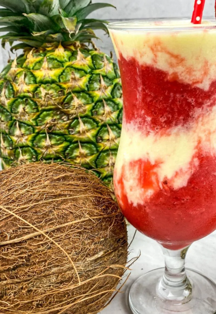 The strawberry daiquiri portion typically includes frozen strawberries, white rum, lime juice, and sugar or simple syrup. This layer provides a bright, tangy sweetness that balances the richer coconut flavors.