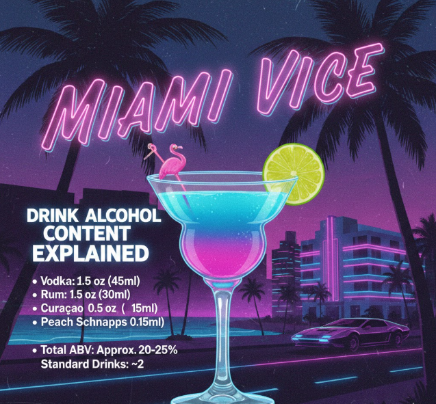The name “Miami Vice” is inspired by the vibrant nightlife and pastel aesthetics associated with South Florida in the 1980s, popularized by the television series Miami Vice. While the drink itself is not officially connected to the show, it embodies the same tropical, stylish, and relaxed energy.